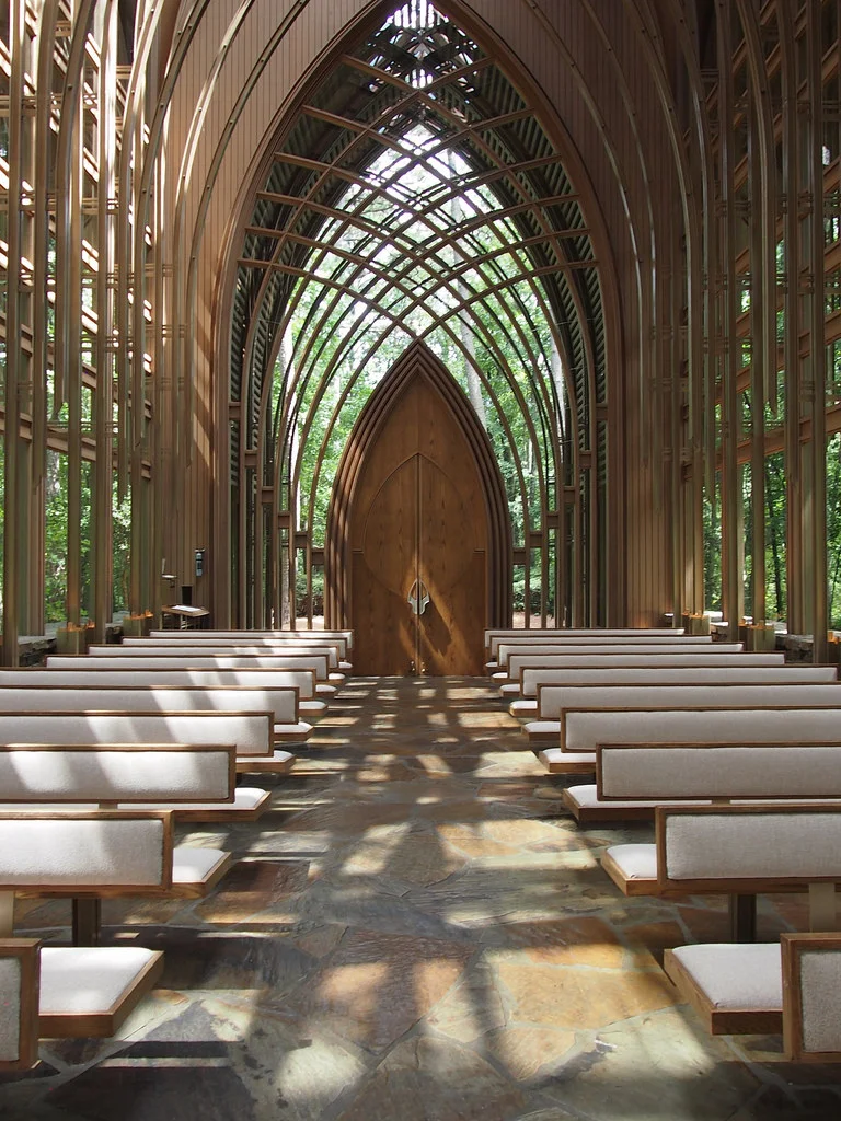The Mildred B. Cooper Chapel in Arkansas overlooks Lake Norwood. It is encompassed by towering pines and stately oaks. It was designed by architects E. Fay Jones and Maurice Jennings. Its open construction creates a harmony with it's natural surroundings. Many people feel at peace with God within nature rather than a building. The Cooper Chapel is a great blending of the two.